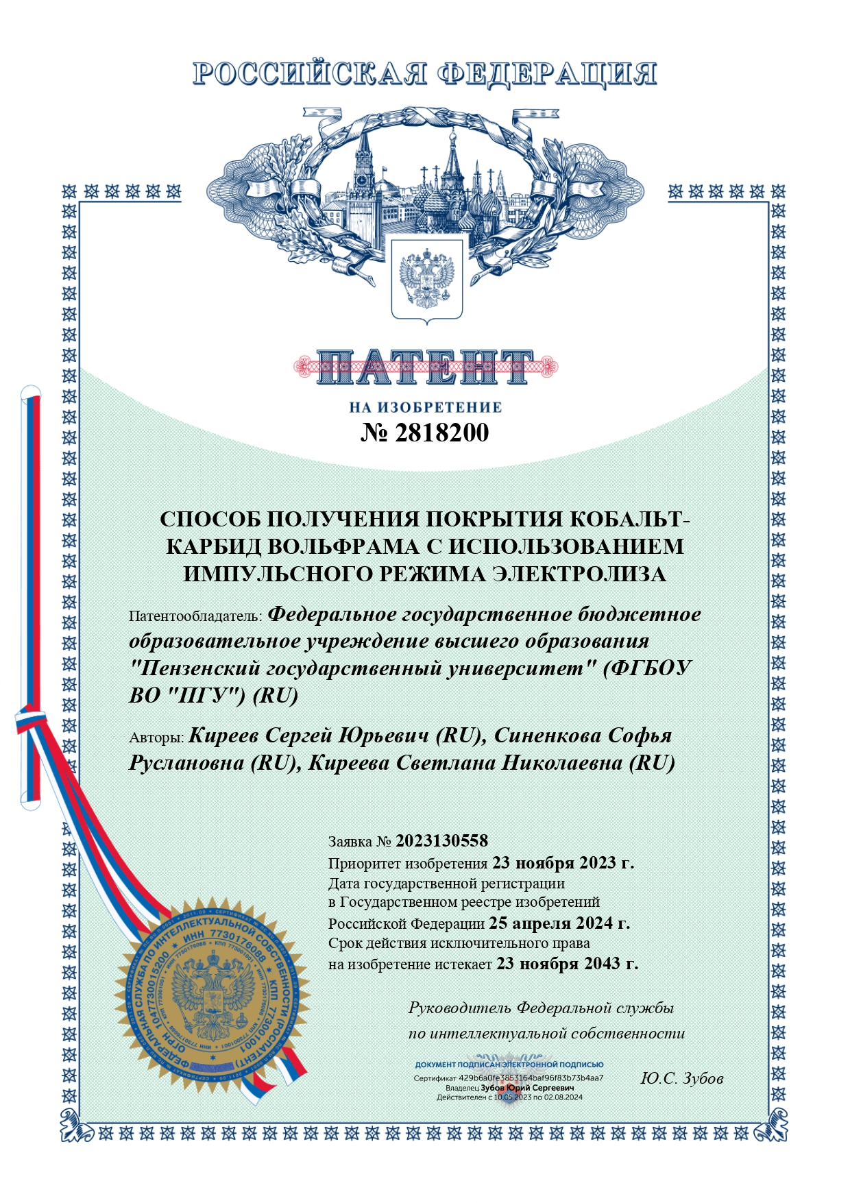 Сотрудники кафедры «Химия» д.т.н., профессор Киреев С.Ю. и к.т.н., доцент Киреева С.Н., совместно со студенткой группы 21МХ Синенковой Софьей Руслановной, решением Федеральной службы интеллектуальной собственности получили патент на изобретение «Способ получения покрытия кобальт-карбид вольфрама с использованием импульсного режима электролиза». Дата государственной регистрации 25.04.2024 г.